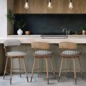 Le tabouret de bar Opera est un siège luxueux au style unique pour un espace bar. Il combine différents matériaux pour créer un design contemporain qui rappelle une chaise de ferme avec une touche d'inspiration rétro. Doté d'une assise et d'un dossier en bois finis en chêne et recouverts d'un tissu coussiné pour plus de confort, le siège se présente visuellement en trois parties. Le dossier et le coussin sont reliés par une section intermédiaire qui intègre un cadre d'accoudoir tubulaire avec des fuseaux torsadés vers le bas finis en cuivre antique pour une touche d'élégance. Un design qui englobe et soutient véritablement. Le cadre comporte quatre pieds en bois finis en chêne, assortis au bois de l'assise. Un repose-pieds circulaire arrondi améliore les niveaux de confort et sa finition en cuivre antique s'harmonise avec les extrémités des pieds tout en ajoutant une touche décorative et un look cohérent. La hauteur fixe de la chaise permet d'assurer la cohérence de la disposition des sièges. Des bouchons de protection sont inclus pour éviter d'endommager les sols ou les surfaces.
